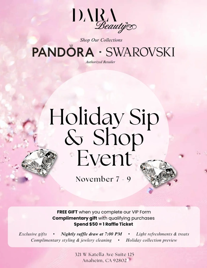 ✨ Holiday Sip & Shop Event at Pandora, located inside Dara Beauty! ✨