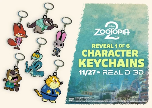 See ZOOTOPIA 2 in RealD 3D on Thanksgiving, 11/27, and get your paws on a souvenir. Bring home one of six mystery character keychains.