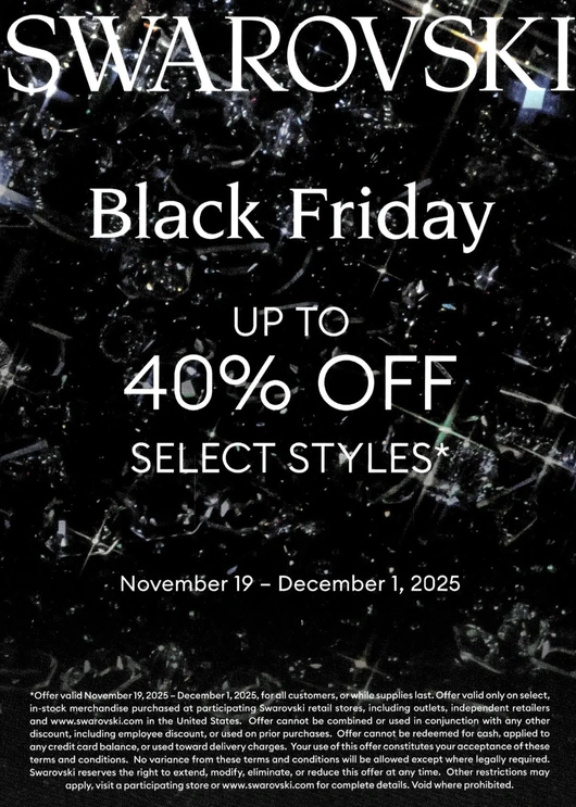 Sparkle this season with Swarovski’s Black Friday event. ✨ Enjoy up to 40% off select styles from November 19 to December 1, 2025. Elevate your holiday look with timeless brilliance.