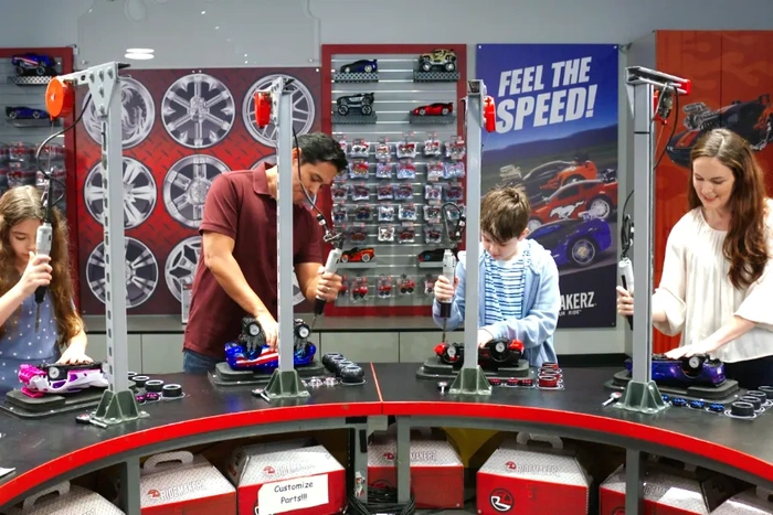 Ridemakerz invites guests, or "Customizers", into the ultimate car customizing experience where they can build one-of-a-kind Ridez (1:18 scale; about the size of a football). Between body styles and colors, rims and tires, lights and sounds, accessories and decals, there are more than 649 million possible combinations, not including individual decal placement! Ridez can also be built and purchased online.